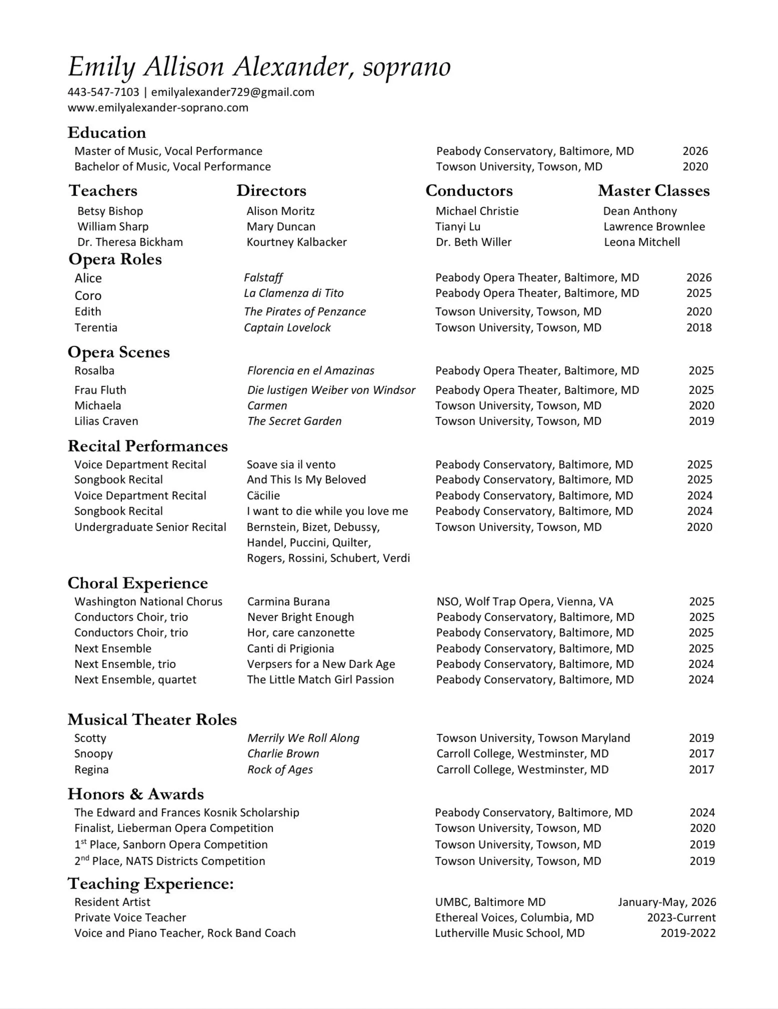 Emily Allison Alexander is a Maryland-based baby dramatic soprano, passionate about performance, collaboration, and nurturing young artists. Her musical journey began at age four with violin and piano, ultimately evolving into a deep love for singing. After discovering her calling in high school, she opted for a career in music, receiving her bachelor’s degree in Vocal Performance from Towson University, and currently pursuing her master’s degree in classical voice at Peabody Conservatory, Johns Hopkins University, in the studio of Betsy Bishop.